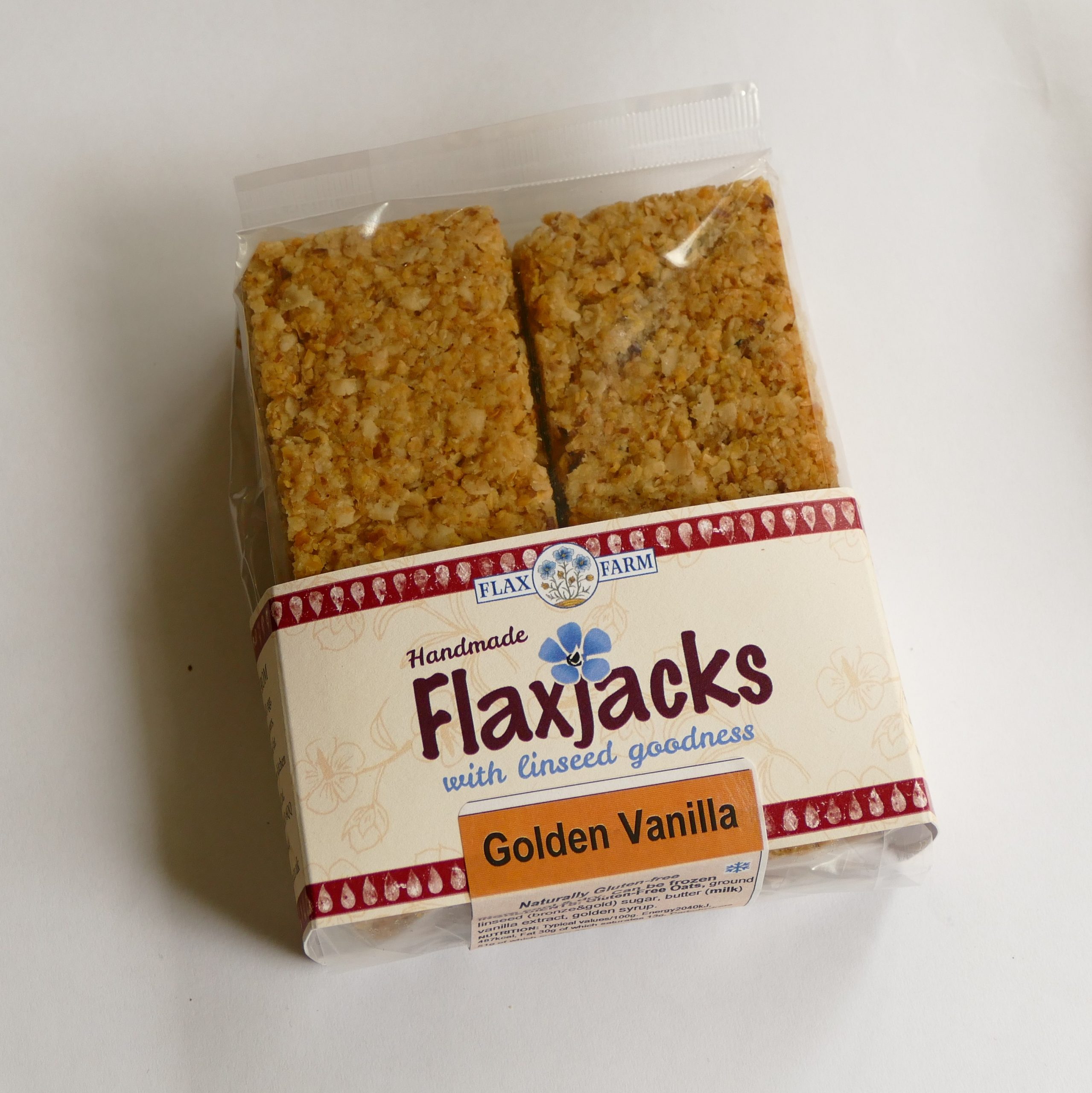 Flax Farm Flaxjacks® are naturally wheat-free. The traditional ones are just rolled oats and freshly-ground bronze and gold linseed and we have gluten-free and vegan options. Flaxjacks® have less butter and sugar than ordinary flapjacks and up to two dessert-spoons of freshly ground linseed in each cake so you get a powerful daily helping of omega-3 and fibre.